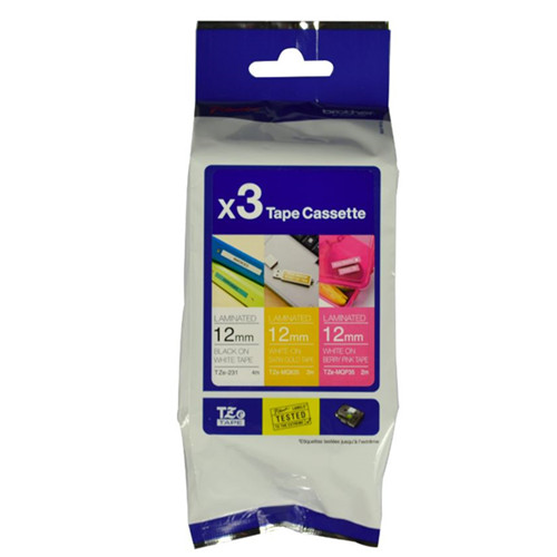 Multi pack includes: Black on White 4m x 12mm / White on Satin Gold 2m x 12mm / White on Berry Pink 2m x 12mm._x000D_ For use with Brother PTP300BT, PTH110, PTH110BK, PTH110WH, PT1290, PT2030, PT2730 and PTP700 labelling machines.