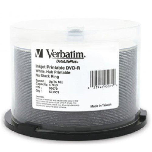 • Verbatim DVD-R 4.7GB 16x White Wide Inkjet Printable 50pk on Spindle